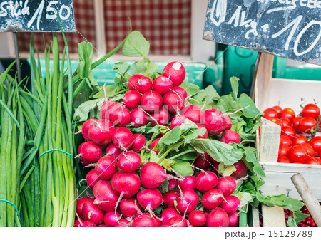 Garden radish and spring onions on a market stall