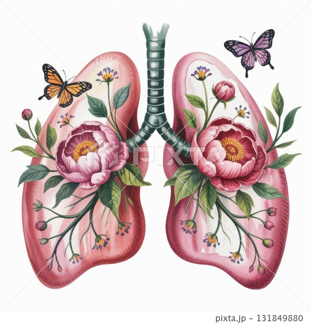 Beautiful Watercolor Illustration of Lungs Surrounded by Flowers and Butterflies in a Lively Garden Scene