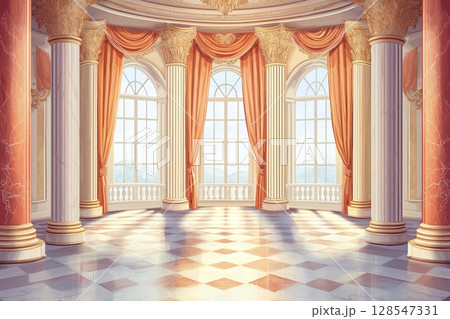 Grand hall with large windows in palace or castle, surrounded by lush greenery