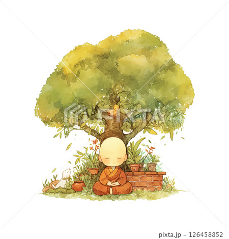 Meditative monk practicing mindfulness under a large flowering tree in a serene garden setting