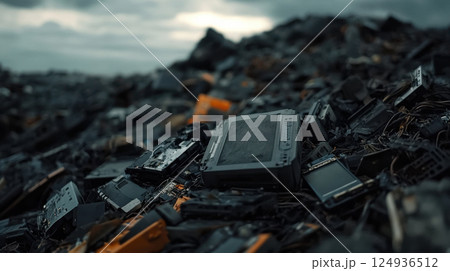 Discarded electronics in massive e waste dump, showcasing environmental impact