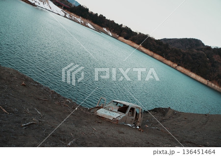 記録的渇水によりダム湖の湖底から数十年ぶりに姿を現した廃車体(神奈川県津久井湖)