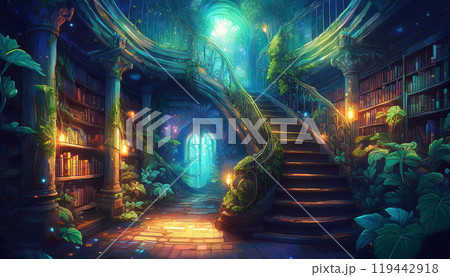植物が絡む階段のある図書館