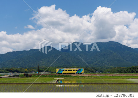 田植えが終わった田園地帯を走る平成筑豊鉄道400型