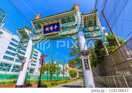日本の横浜都市景観 横浜中華街・青空に映える延平門などを望む