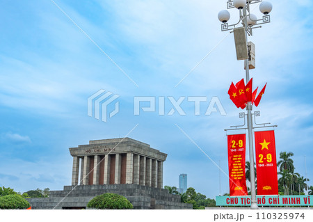 ベトナムハノイ市 バディン広場から見たホーチミン廟とナショナルデーの旗