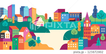Colorful Urban Landscape. Modern Cityscape with Buildings, Trees, and Open Spaces.