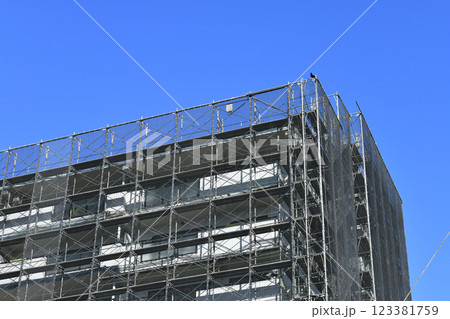 日本の横浜都市景観 マンションの補修や点検等のため組まれた足場や防護ネットなどを望む=横浜市内