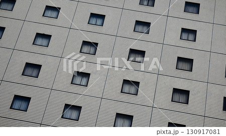 白いブラインドが並ぶ建物の外観と整ったガラス窓(ミニマル・幾何学模様)