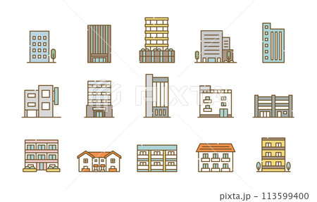 いろんな建物のアイコンセット ビル 家 マンション オフィス 工場 ショッピングモールなど カラー