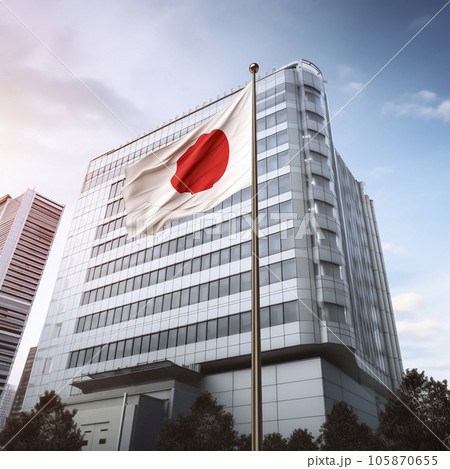 日本の日の丸の国旗と庁舎の外交イメージ「AI生成画像」