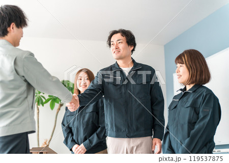 握手をする作業着姿のビジネスマン男女(契約・協定・商談・合意・協力)