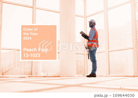 Foreman at work on construction site checking his notes on clipboard on peach fuzz color background of the year 2024