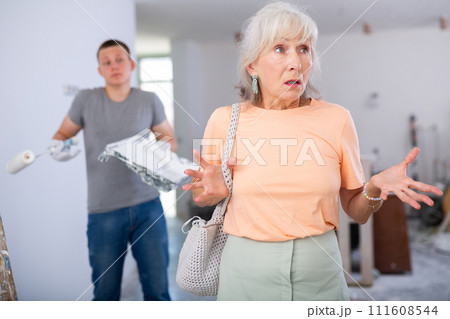 Happy homeowner stand in front of contractor and shake hand, handyman holding clipboard and after checking details before renovations home, house improvement interior, Interior design
