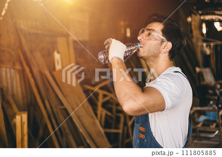 Worker drinking water in an wood industrial factory. Working hydrated watering at work. Water to the body healthcare.