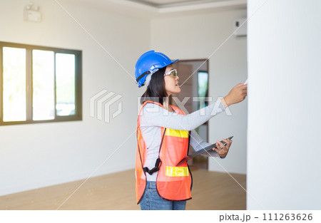 Professional woman home Inspector surveyor wearing vests and hard hat at new property