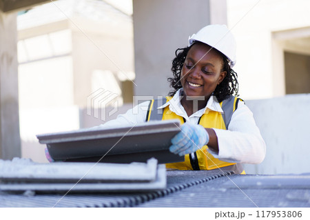 An African American female contractor is examining rooftop tiles at the construction site. The female foreman is inspecting the construction materials.