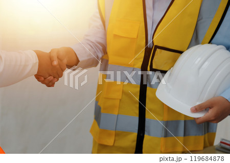 Construction and structure concept of Engineer or architect meeting for project working with partner and engineering tools on model building and blueprint in working site, contract for both companies.