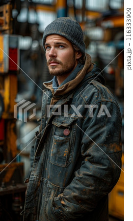 Young carpenter working wtih electric power drill tool, wearing overalls and holding drilling gun. Handyman contractor using cordless drill to work on renovation and refurbishment.