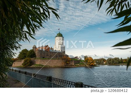Vyborg Castle in Russia, standing on a small island surrounded by water, under a blue sky with clouds. This historic medieval fortress is a key tourist attraction in the Vyborg region.
