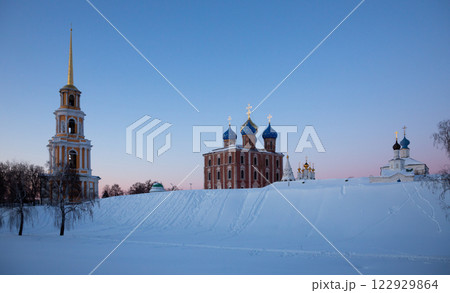 View of the Ministry of Defence of Russian Federation, and Moscow river embakment with cruise ships at sunset.