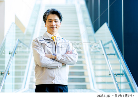 作業服姿の男性 カメラ目線 笑顔のポートレート