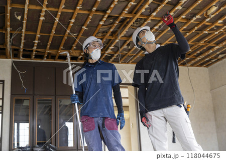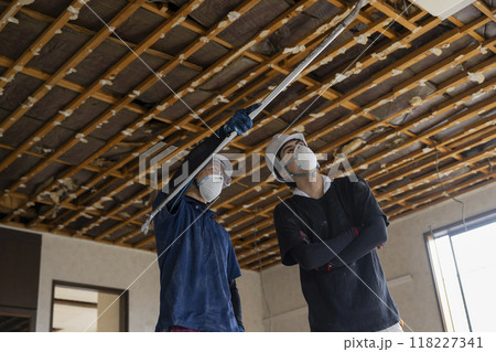 天井裏で工事をする男性