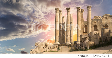 Roman ruins (against the background of a beautiful sky with clouds) in the Jordanian city of Jerash (Gerasa of Antiquity), capital and largest city of Jerash Governorate, Jordan