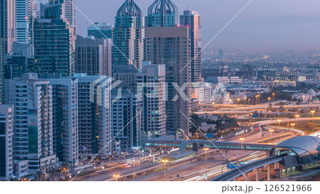 Dubai Marina skyscrapers aerial top view before sunrise from JLT in Dubai night to day timelapse, UAE.
