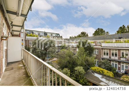 A scenic balcony view showcases green trees and beautifully arranged buildings, enhancing the urban landscape's charm and tranquility.