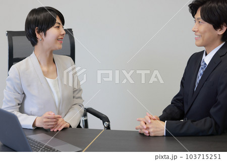 ワンオンワン_女性上司からのコーチング_良い評価に笑顔のビジネスマン_1