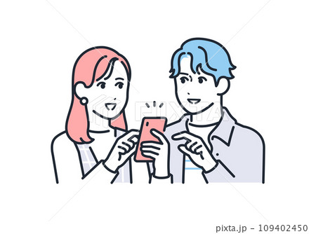 スマートフォンを見ながら相談する若い男女のシンプルなベクターイラスト素材