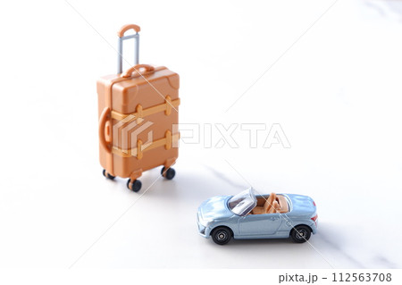 ふたり乗りのオープンカーとスーツケースで、ドライブ旅行へ出発するイメージ