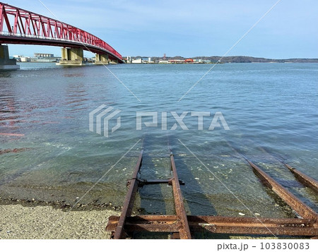 船の引き上げ船台(引揚船台) のレールと厚岸大橋