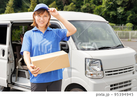 女性ドライバーが笑顔で荷物届ける。物流、宅配、引越し業者のイメージ。