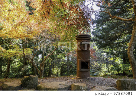 紅葉がきれいな神社にたたずむ古びた引退ポスト