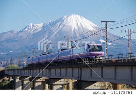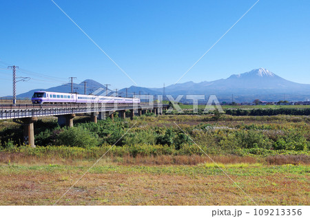 冠雪の大山を背景に日野川の鉄道橋を駆け抜ける標準ゆったりやくも色でパノラマ編成の381系特急やくも号