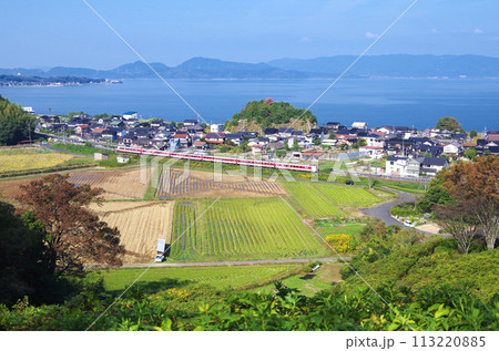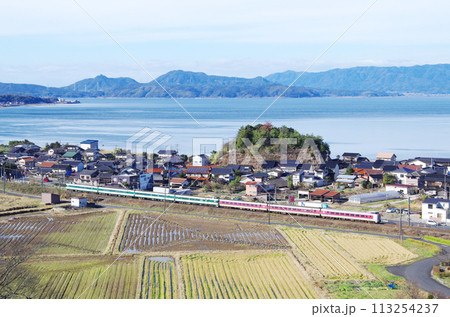 中海沿いを走る特急やくも号を古代出雲王陵の丘公園から眺めた構図(写真)
