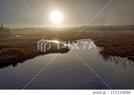 朝日差す吾妻連峰・弥兵衛平の湿原と明星湖