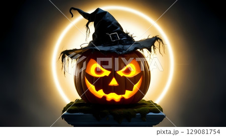 Halloween jack-o'-lantern wearing witch hat with glowing face