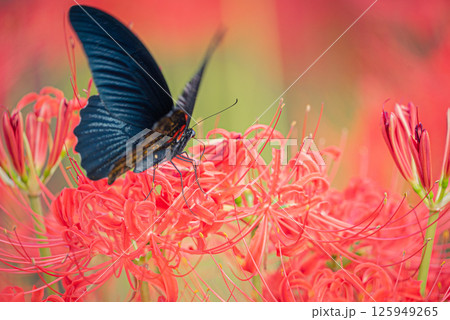 クロアゲハ蝶と赤と白の曼殊沙華のお彼岸の風景