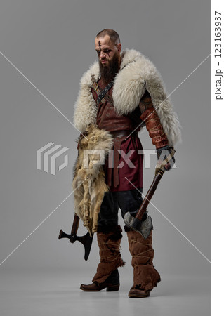Portrait of serious man as medieval Viking with furious gaze and dark makeup, in fur cloak, armor, standing with axe against grey studio background.