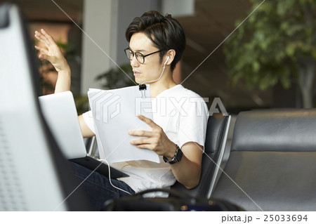 空港で飛行機の待ち時間に仕事をするビジネスマン