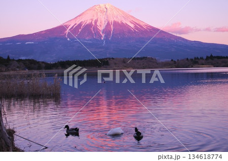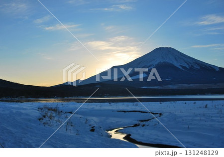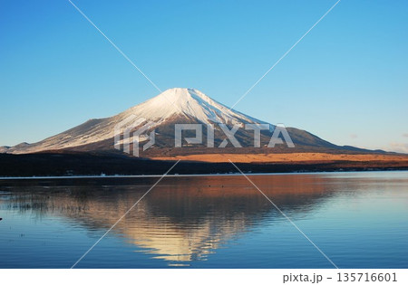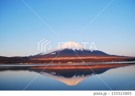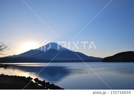 河口湖から夜明けを告げる光りを浴びる「富士山」