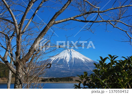 河口湖畔から、開花を待つ桜の木と「富士山」