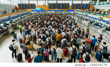 旅行に出発! 混雑する空港ロビー-AI生成画像
