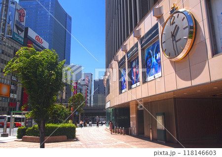 都会の繁華街を観光しながら趣味の一眼レフで写真を撮るカメラ女子|待合せイメージ|カメラマンイメージ