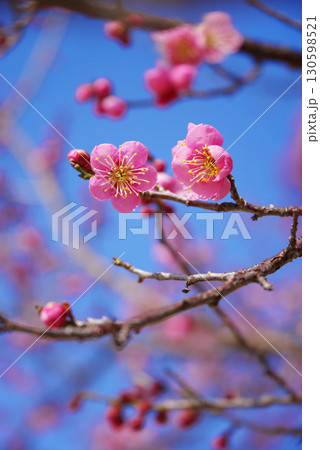 ピンク色の綺麗な梅の花の咲く枝、お祝いイメージ