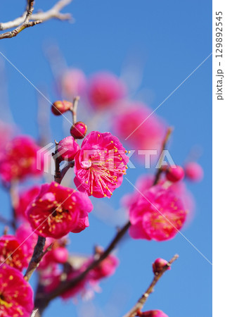 冬に咲く濃いピンク色のかわいい紅梅の花の枝
