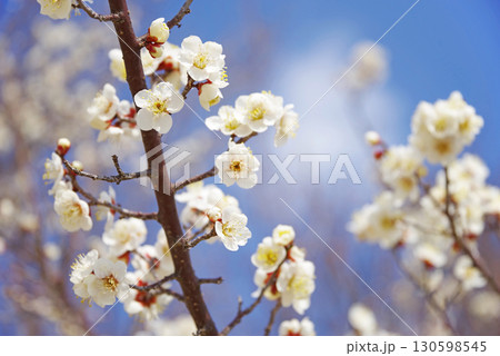 寒空の下咲く紅梅の花のアップ、新春イメージ